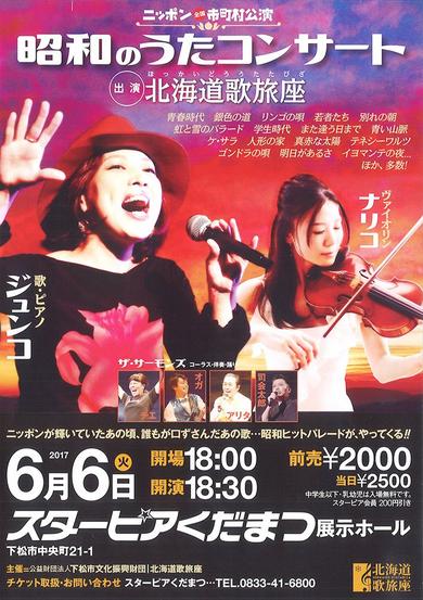 昭和の懐かしい名曲の数々を全国に届けている北海道歌旅座のニッポン全国市町村公演“昭和のうたコンサート”が6月6日午後6時半から下松市のスターピアくだまつ展示ホ...
