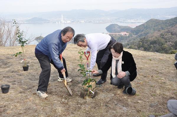 【下松市】笠戸島家族旅行村に“椿ロード”を 苗木50本を植樹 矢野、田中さんが寄贈