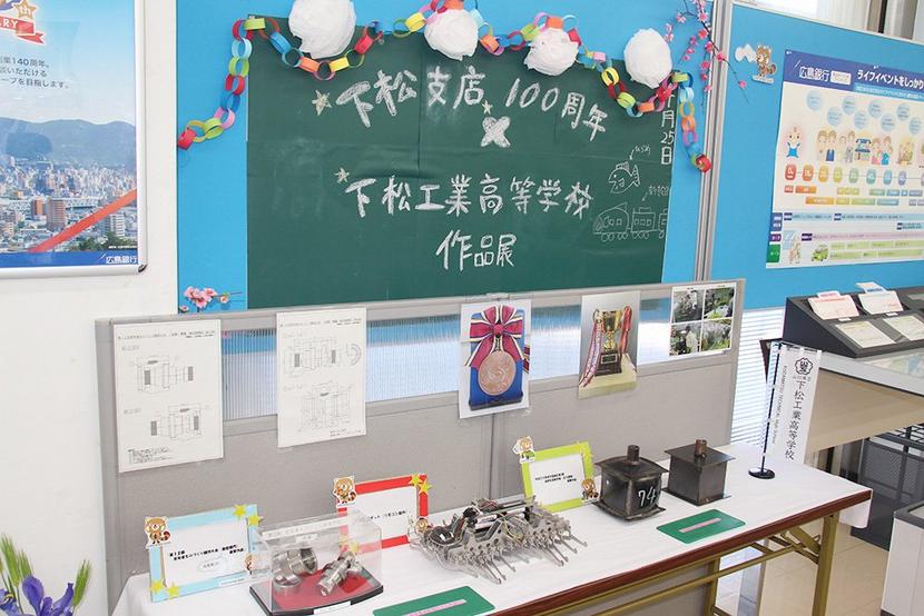 下松市西豊井の広島銀行下松支店(土井康稔支店長)で9日から開店100周年記念イベントが始まり、同支店の開設と縁の深い下松工高の生徒が制作した工業作品をロビーに...