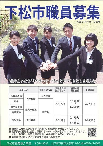 下松市は来春の職員の採用へ初めてポスターを制作した。今春入った職員5人が笑顔で並ぶ写真を使い、A2判のポスター100枚のほかA4判のチラシ1,000枚を制作し...