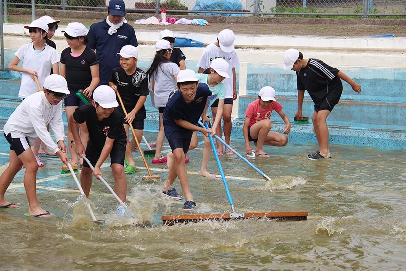 プールを清掃する児童