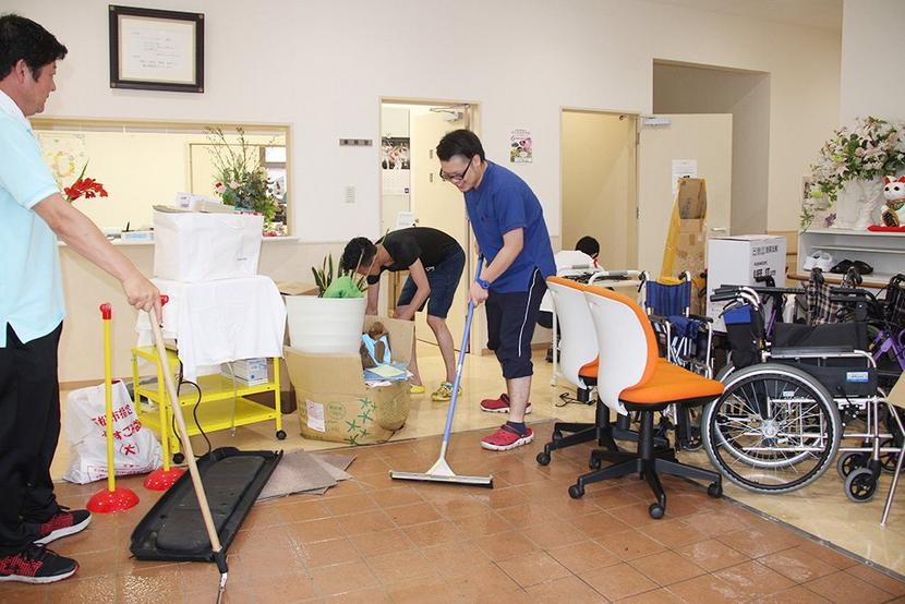 泥をかき出す従業員=古川町・来歩リハビリステージ