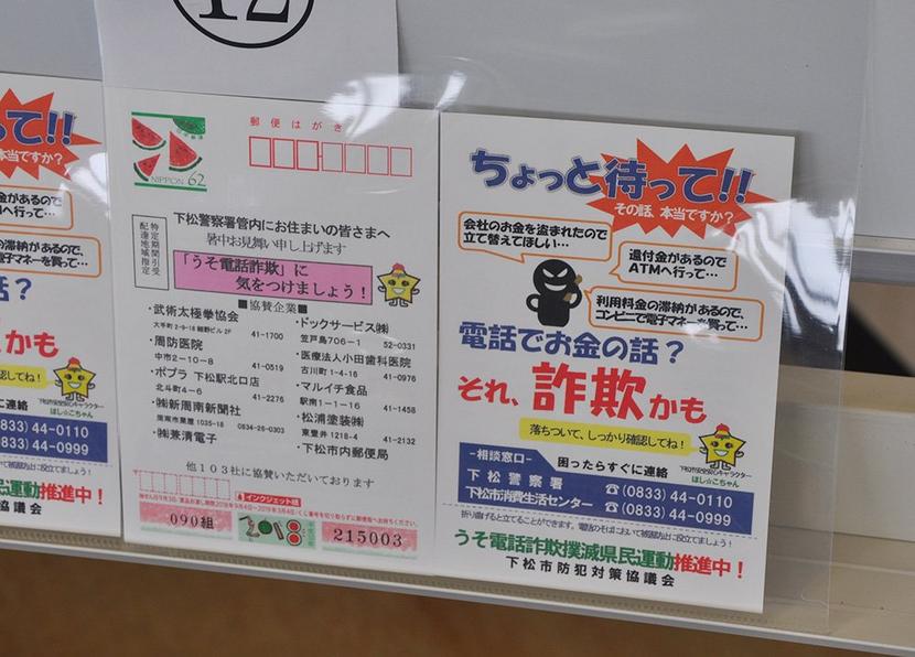 多発するうそ電話による詐欺被害を防ごうと7月27日、下松市で「うそ電話詐欺被害防止DM(ダイレクトメール)大作戦」が始まった。市防犯対策協議会(会長・国井市長...