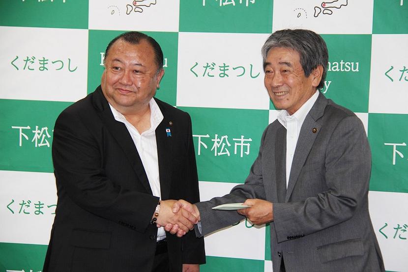 義援金を託す中村社長(左)