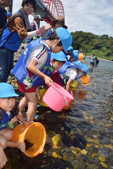 下松市の笠戸大橋の橋脚近くにある洲鼻海岸で18日、愛隣幼児学園(伊藤三奈園長)と平田保育園(伊藤雅子園長)の園児37人と保護者など合わせて計110人がごみを拾...