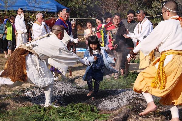 下松市笠戸島江の浦の白浜駐車場で25日午前11時から“笠戸の火祭り”が開かれ、古いお札やお守り、護摩木を燃やした灰の上を素足で歩いて無病息災を祈る“火渡り”な...