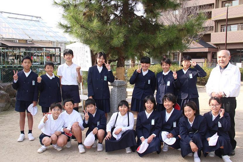 鼎の松の前の児童たち
