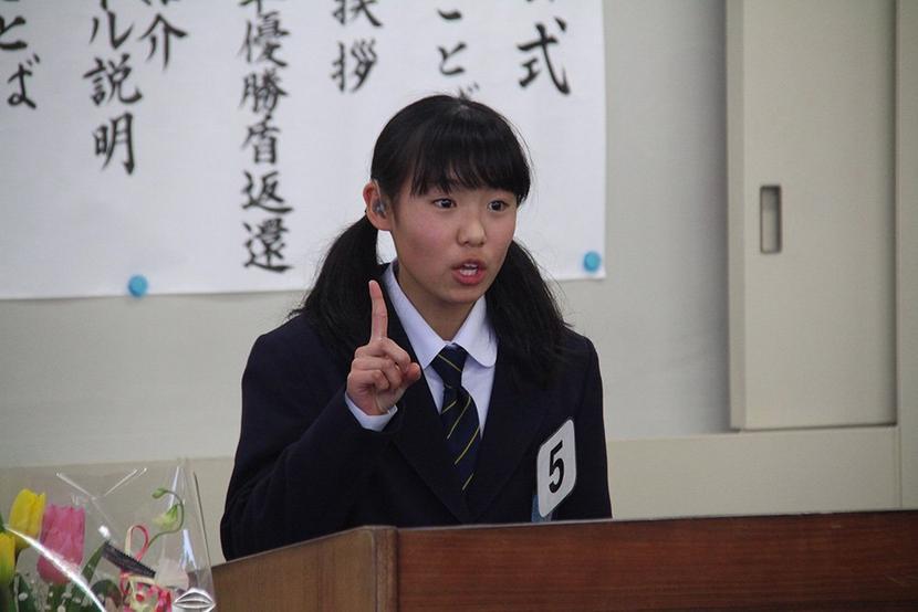 第31回下松市中学校英語暗唱大会が23日、市役所5階会議室で開かれ、市内3校から選抜された1、2年の計19人が出場し、昨年の前回は4位だった末武中2年の安藤柚...