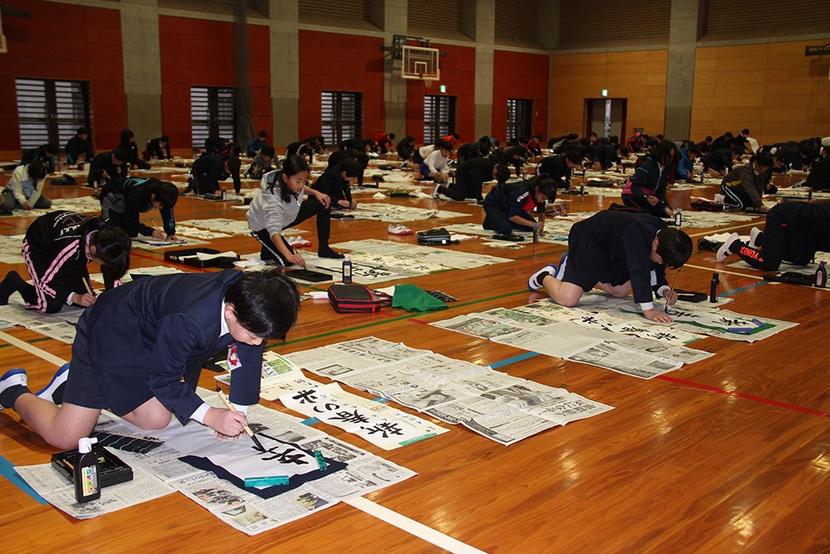 下松市の下松小(藤本哲城校長、730人)で10、11両日、書き初め大会が体育館で開かれ、4年生以上の児童が新年の目標や夢を書き上げた。 5年生117人は10...