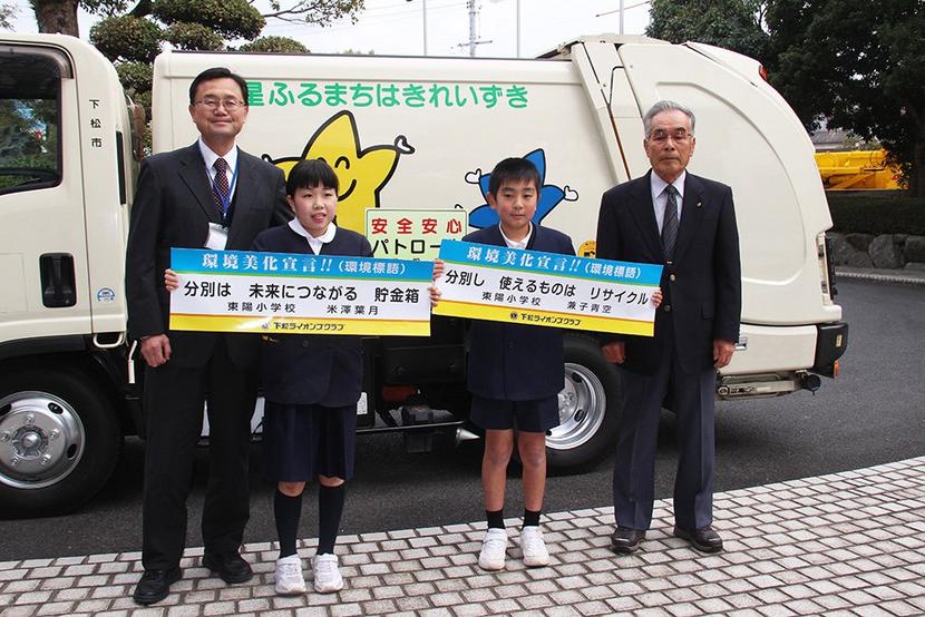 下松市の下松ライオンズクラブ(浜田謙二会長、30人)は20日、東陽小5年生から募集した環境標語2点が書かれた清掃車用のステッカー32枚を市に贈った。ステッカー...