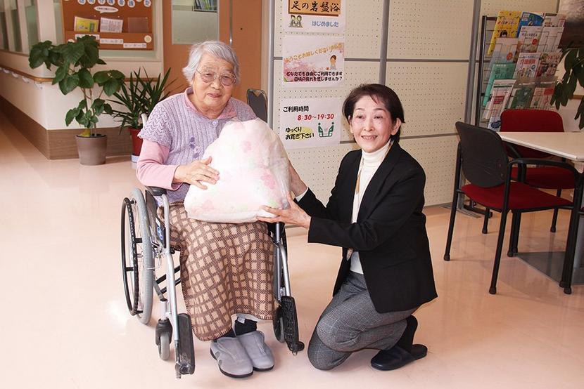古布を持つ藤井さん(左)と塩川会長(ほしのさと)