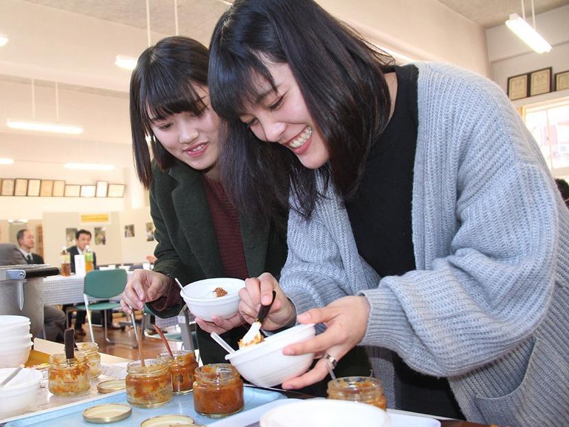 ゆず味噌を試食する学生