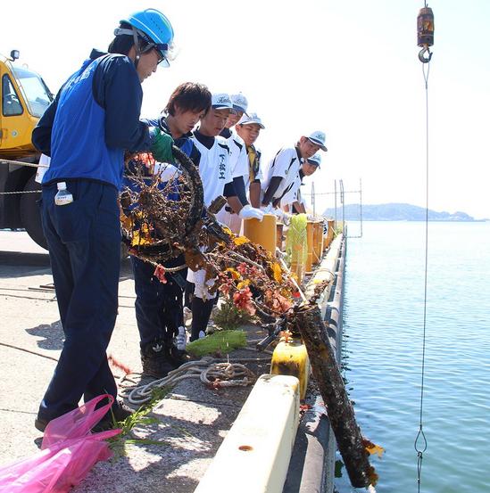 岸壁で清掃する人たち