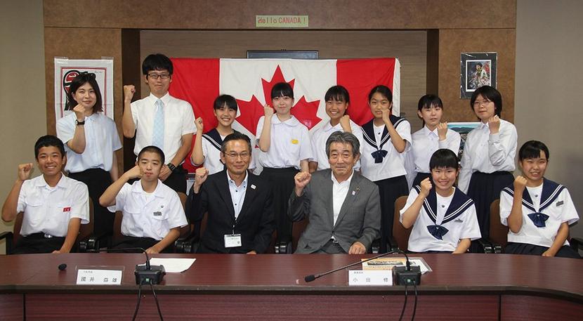 21日から8月9日までの20日間、カナダ西部のブリティッシュ・コロンビア州を訪れる下松市の海外語学研修生の中学生10人と同行の教員2人が11日、市役所で国井市...