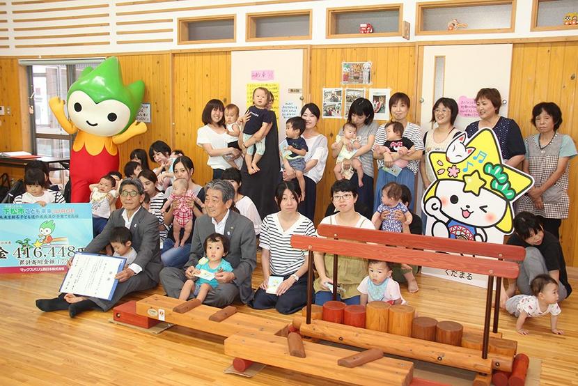 遊具(手前)に喜ぶ親子と国井市長、加栗社長