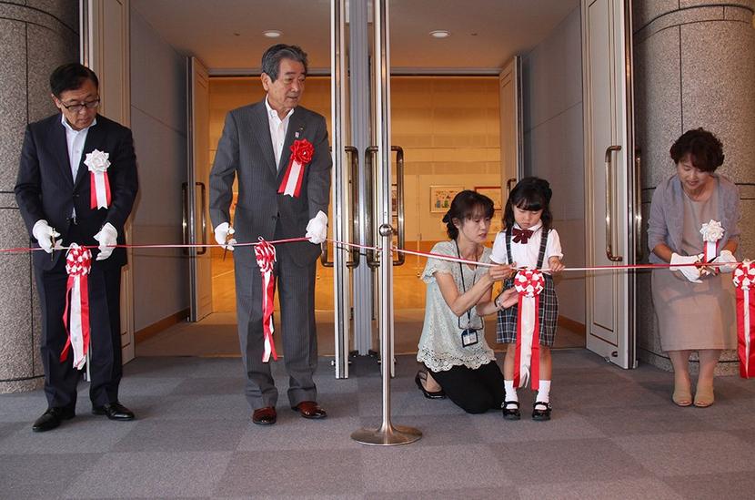 テープカットの左から新関事務局長、国井市長、伊豫岡さん、福田実行委員長