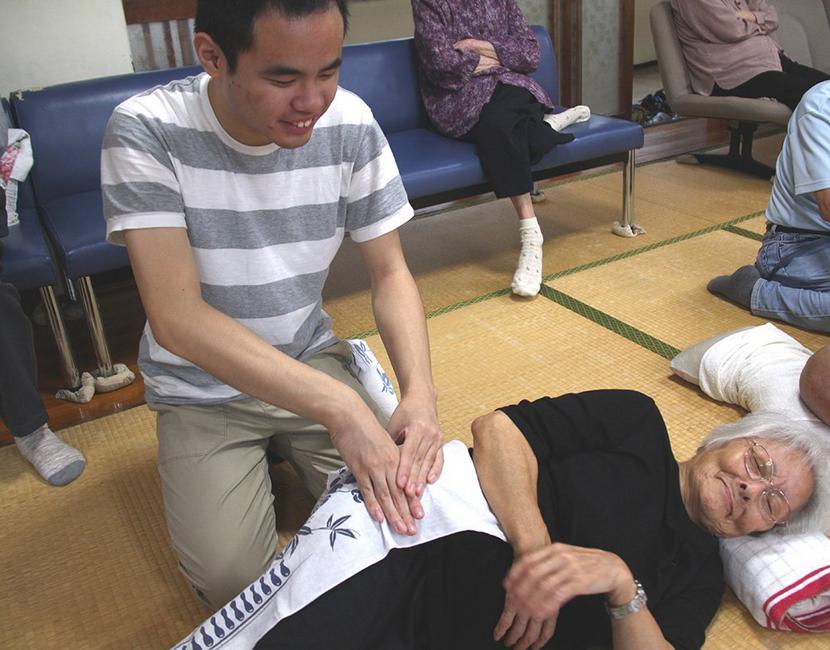 周南市西金剛山の養護老人ホームきさんの里(住吉春恵施設長、96人)で1日、市視覚障害者福祉協会(河島栄二代表)のマッサージ奉仕活動が開かれ、入所者約30人がプ...