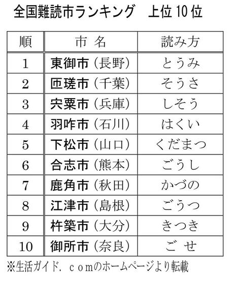 読み方が難しい全国の市のランキング「全国難読市ランキング」で下松市が5位にランクされた。下松は「しもまつ」や「したまつ」など県外で正しく読んでもらえないことが...