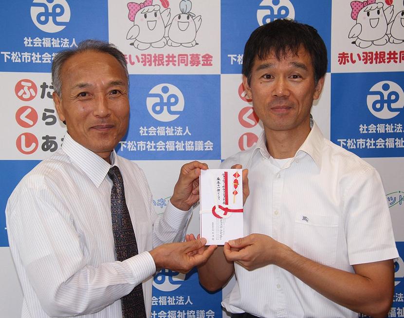 寄付金を持つ網本常務理事(左)と浜田支配人