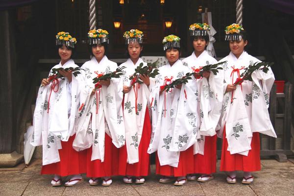 あでやかにみこ舞い披露 花岡八幡宮・秋季例祭で女子6人