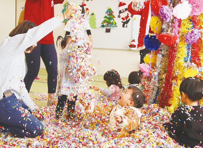 紙吹雪で遊ぶ子どもたち