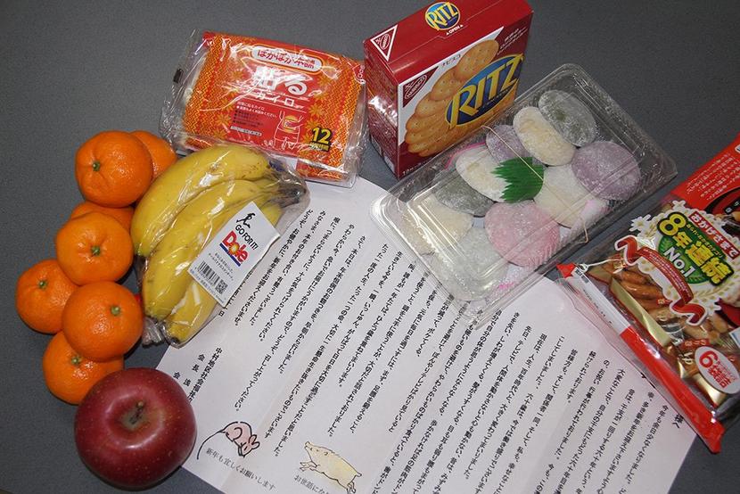 独居老人に届ける餅や果物、菓子、手紙