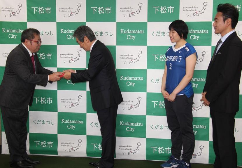 市役所で開かれた贈呈式では、広島市中区の同社中国地区統括本部の茂木不二夫本部長から、国井市長と、同市ゆかりの聖火ランナーの西京銀行のバドミントンチーム“ACT SAIKYO〟の斎藤栞主将(21)と、俳優の元木行哉さん(50)に渡された。