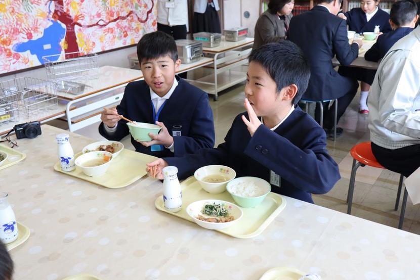 地域下松市下松市の米川小(堀川勝祥校長、10人)の給食室で21日、下松産食材を使った給食があり、2年から6年の児童10人が地元でとれたコシヒカリやレンコンなどを味わった。
