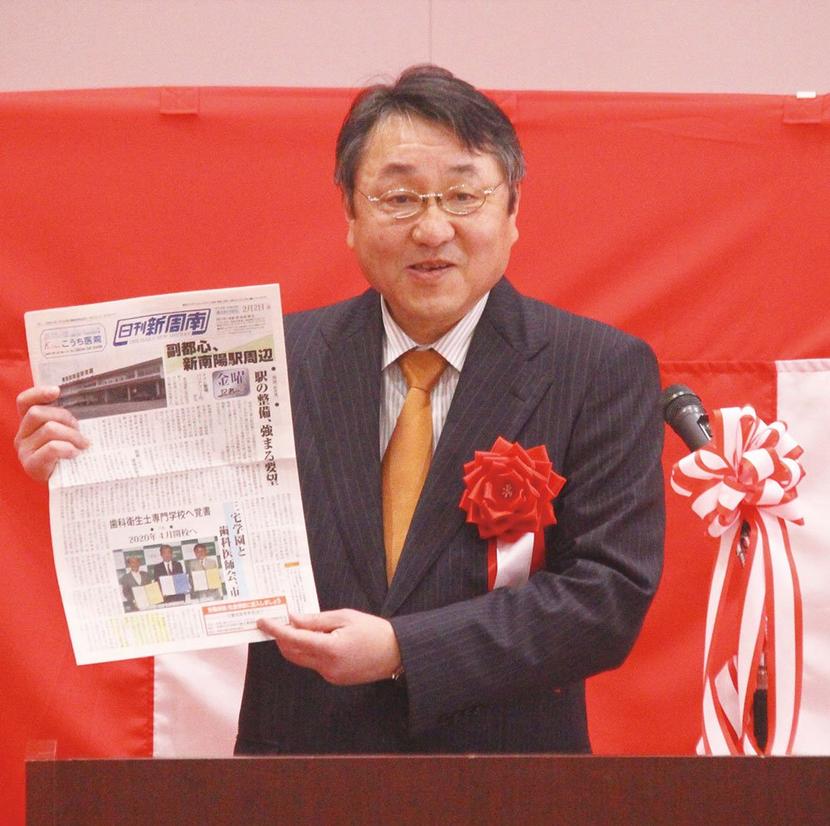 バドミントンコートも兼ねた2階ホールで開いた式典で三宅理事長は「下松の地を選んでよかった。広島にない素晴らしい教育環境をこの学校で実現したい」とあいさつ。国井市長や原野会長が祝辞を述べ、原野会長は同校の下松進出を伝える2018年2月2日の日刊新周南の記事を示しながら「私たち歯科医師会も学校運営に全面的に協力していく」と開校を歓迎した。