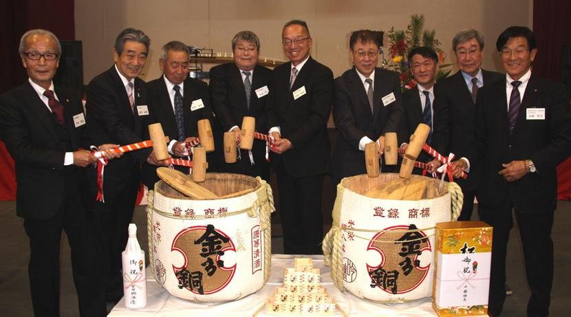 年男、年女の松村常男、倉冨浩、厚東和彦、中村淳朗、中田典保、弘中敏夫さんと金藤会長、国井市長、中村隆征市議会議長が酒樽の鏡開きをし、地区自治会連合会の村上基起副会長の発声で乾杯。懇親会では花岡婦人会が作ったおでんが人気を集め、清水館長の音頭で万歳三唱をした。