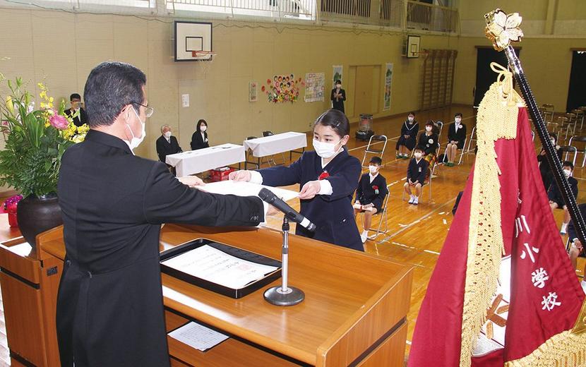 卒業式は新型コロナウイルス感染防止対策で地域住民など来賓を招待しない形で、規模を縮小して開催。堀川校長が卒業生の伊内愛董(まなと)君、弘中蓮さん、松原武劉君、山縣世都さんに一人一人、卒業証書を読み上げて手渡した。