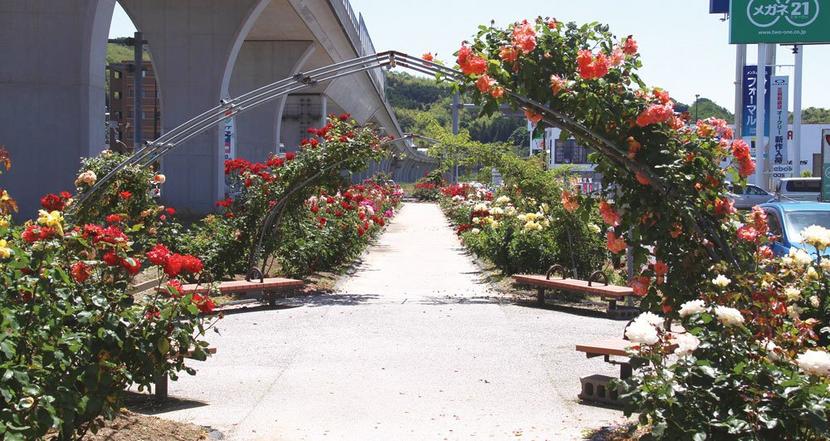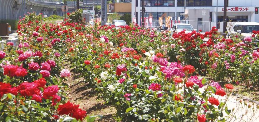 道のオアシスは国が将来的な同高架橋の車線の増加用に確保している幅8メートル、長さ160メートルの空き地。23年前から地元の市民グループ、花岡バラづくりの会(頼本健一会長、20人)がせん定や消毒、除草、水やりの手入れをしている。