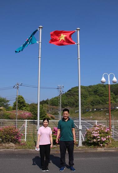 ベトナム国旗(右側)の前のドゥックさん(右)とズンさん