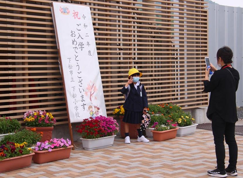 1年生は下校時、玄関前の「祝 ご入学おめでとうございます」の看板の前で記念撮影をしていた。母親と一緒に登校した大嶋悠翔(ゆうと)君(7)は「早く学校に来たかった。友だちをいっぱい作りたい」と楽しそうに話していた。