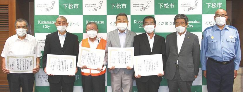 下松市防犯対策協議会(会長・国井市長)の防犯功労感謝状の贈呈式が3日、市役所で開かれ、5人と1団体の功労をたたえた。 この感謝状は昨年までは下松警察署で開...