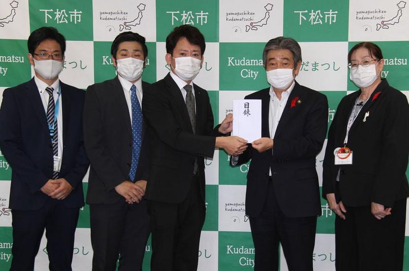 義援金はこの日、星プラザテナント会の中石智之会長(52)と松井伶(れい)販売促進委員長(28)、下松商業開発の藤井雅大営業計画マネジャー(44)が市役所に持参し、地区長の国井市長と同地区事務局長の相本美重子市社会福祉協議会常務理事に手渡した。義援金は日赤を通じて熊本県、鹿児島県などの被災地に贈られる。