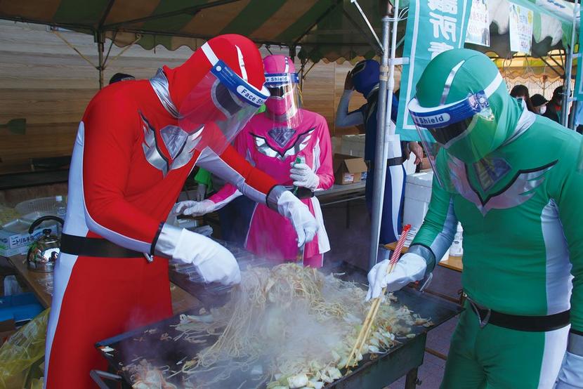コスチューム姿で焼きそばを焼く下松商議所青年部員