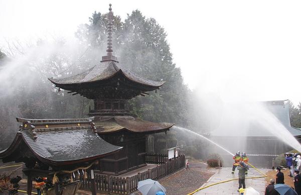 火災から文化財を守ろう! 国重文の多宝塔で消火訓練 コロナで子どもたちの見学なく