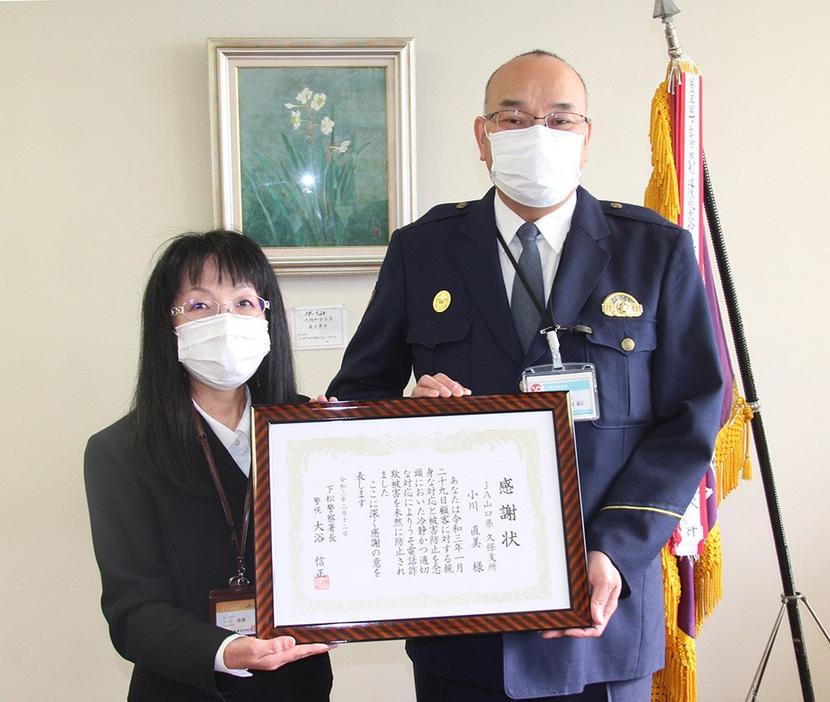 下松警察署は12日、うそ電話詐欺を未然で防いだ功労で、下松市山田、JA山口県久保支所職員、小川直美さん(54)に大浴信正署長の感謝状を贈った。 同署による...