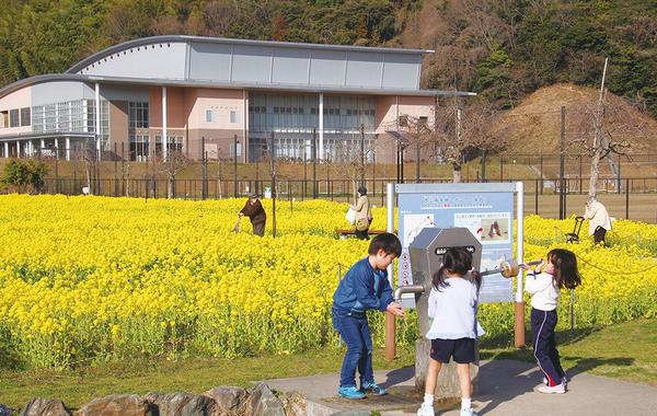 早春に菜の花まぶしく 下松スポーツ公園で満開 井戸の手押しポンプも人気