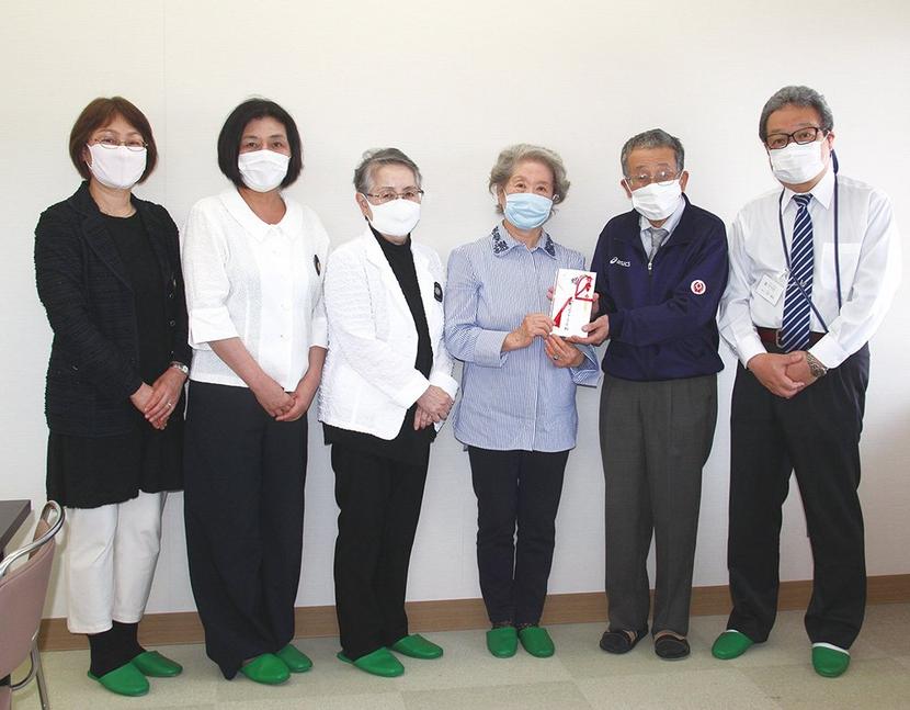 寄付金を持つ右から山村施設長、弘津総苑長、後会長ら