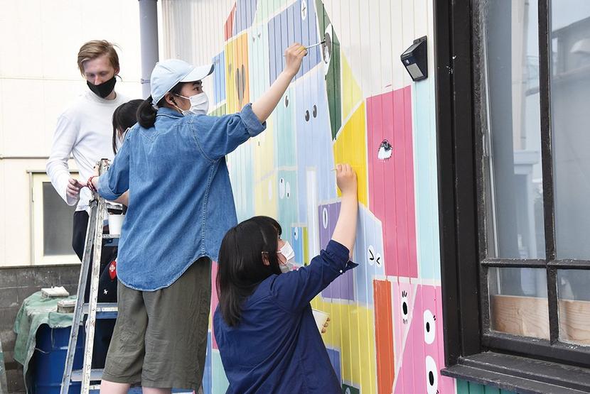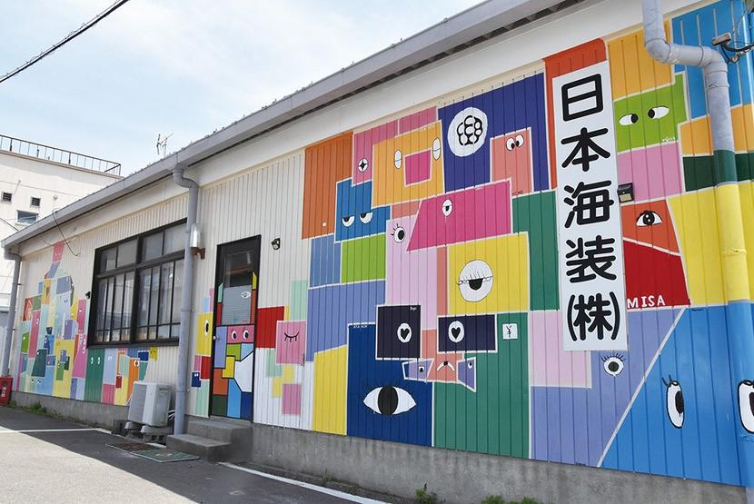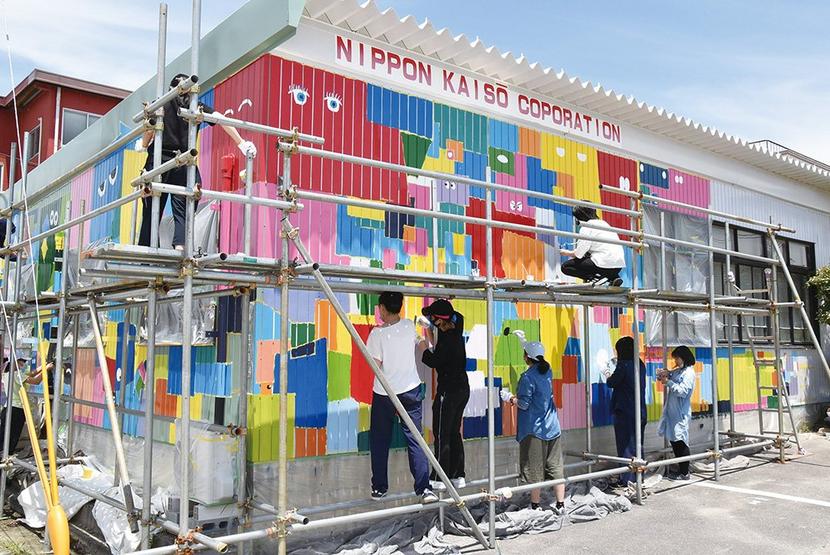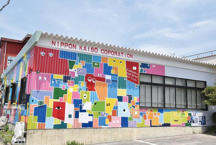 建物の壁などに絵画を描くウオールアート。下松市の下松高美術部(橋村悠月部長、48人)が5、6日、下松市新川の日本海装(今治総一郎社長)の本社の建物をキャンバス...