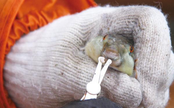 「痛っ!」「キューッ!」 傷予防にトラフグ稚魚を“歯切り”