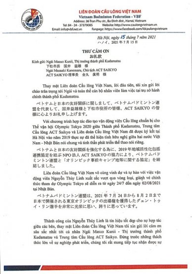 ベトナムバドミントン連盟からの礼状