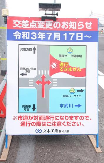 下松市と周南市の市境付近を流れる末武川の荒神大橋の県発注の架け替え工事で、東詰の市道との交差点の改良工事が17日(土)に完成する。そのことを知らせる看板がわか...