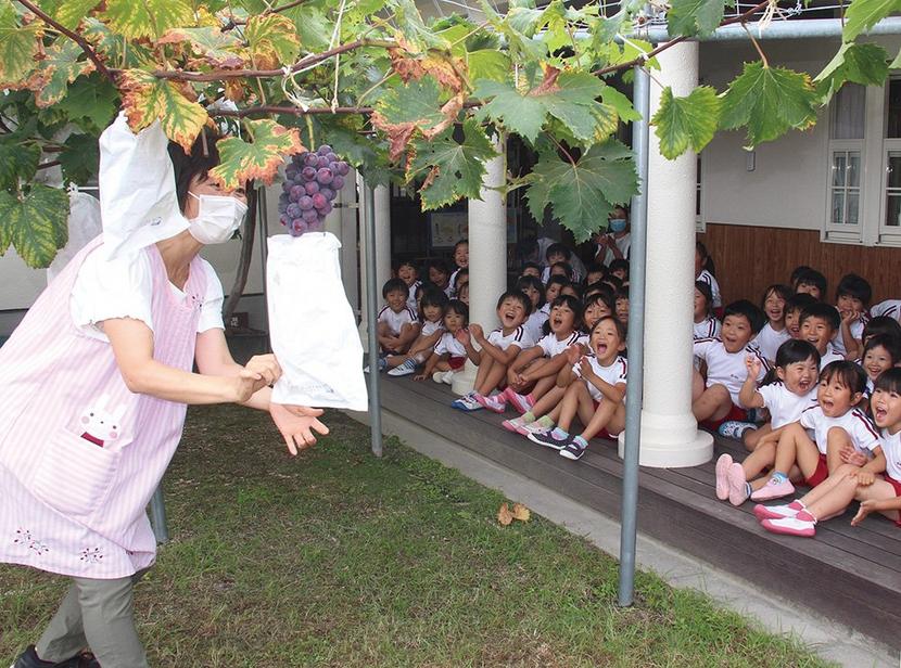 下松市潮音町の保育園、愛隣幼児学園(伊藤三奈園長、97人)で7日、ブドウの収穫祭が開かれ、園内のブドウの木から29房を収穫した。ブドウはさっそく園児が1人3個...