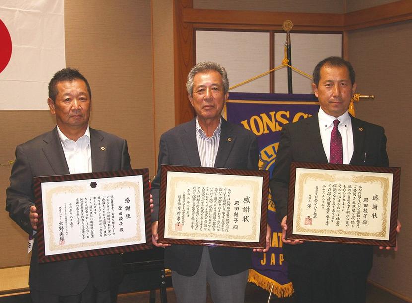 小椋会長から感謝状3通を受け取った治夫さんは「母は大往生の最期に、献眼という大きな貢献ができた。これからもこの経験を活かし、ライオンズクラブのメンバーとして献眼活動に力を入れたい」とお礼を述べ、小椋会長、松田新一幹事と感謝状3枚を手に記念撮影をしていた。