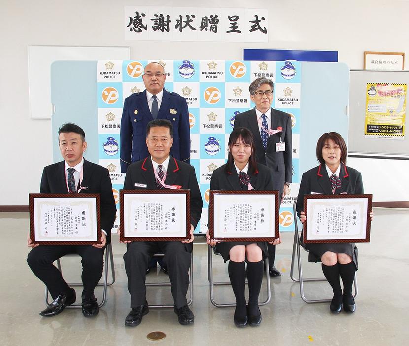 下松警察署は22日、うそ電話詐欺の被害を防いだ下松市の下松郵便局(和田隆次局長)の社員8人に、大浴信正署長の感謝状を贈って功績をたたえた。 同局では今月だけ...
