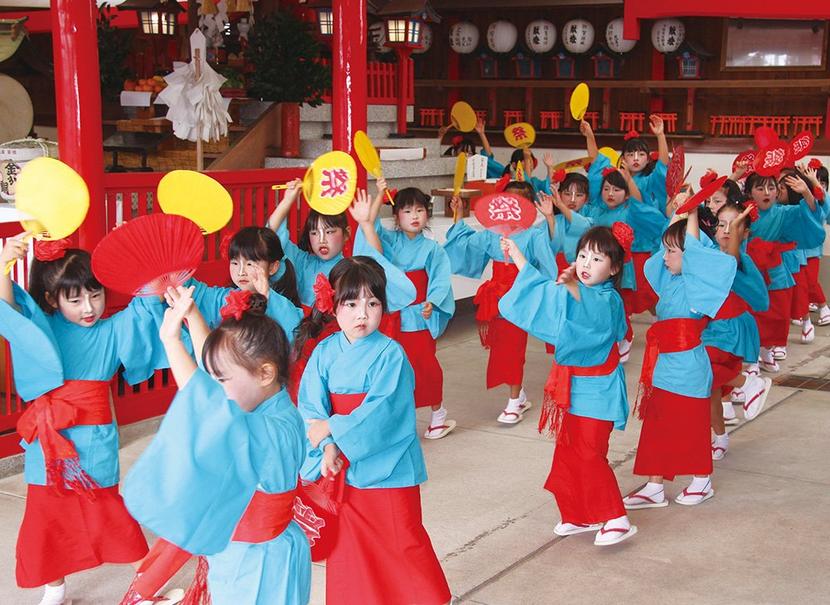 この日は快晴の下、鼓笛パレードや踊りは同寺の境内にある花岡福徳稲荷社の鳥居や社殿を回るコースで開かれ、保護者もカメラを手にして我が子のかわいい姿を真剣に追っていた。