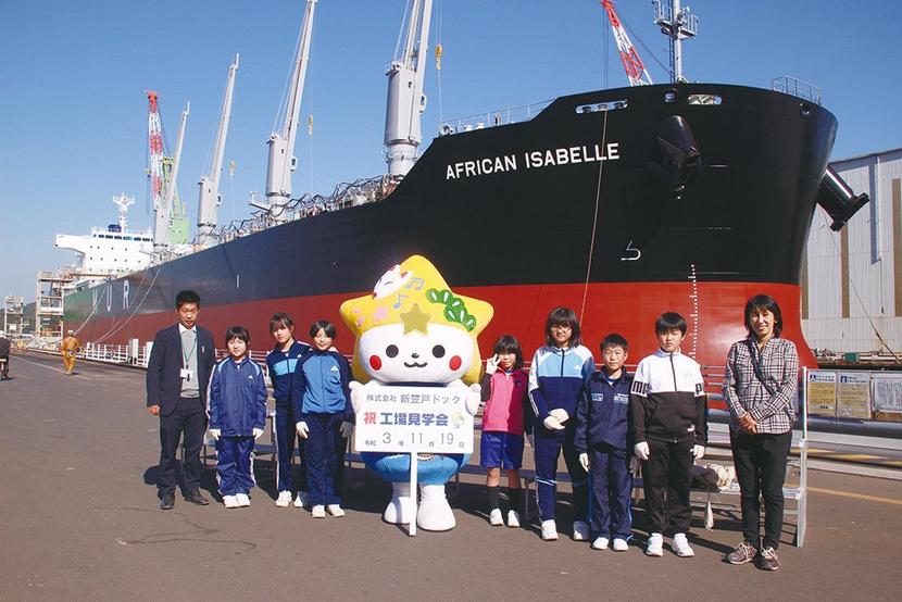 下松市の豊井小(久保田智子校長)の5年生7人と下松小(西本隆校長)の5年生122人が19日、笠戸島の新笠戸ドック(桧垣幸人社長)の造船現場を見学した。同社が小...